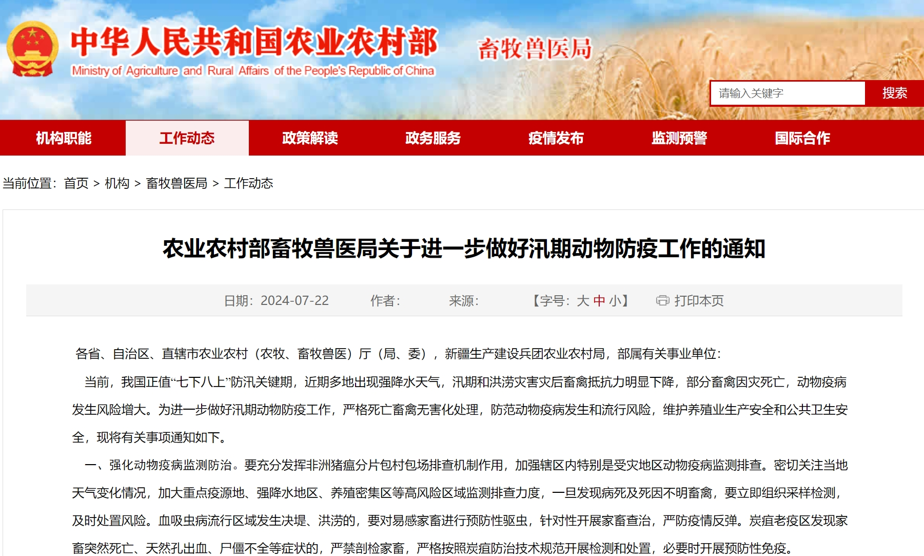 農(nóng)業(yè)農(nóng)村部畜牧獸醫(yī)局關(guān)于進(jìn)一步做好汛期動(dòng)物防疫工作的通知