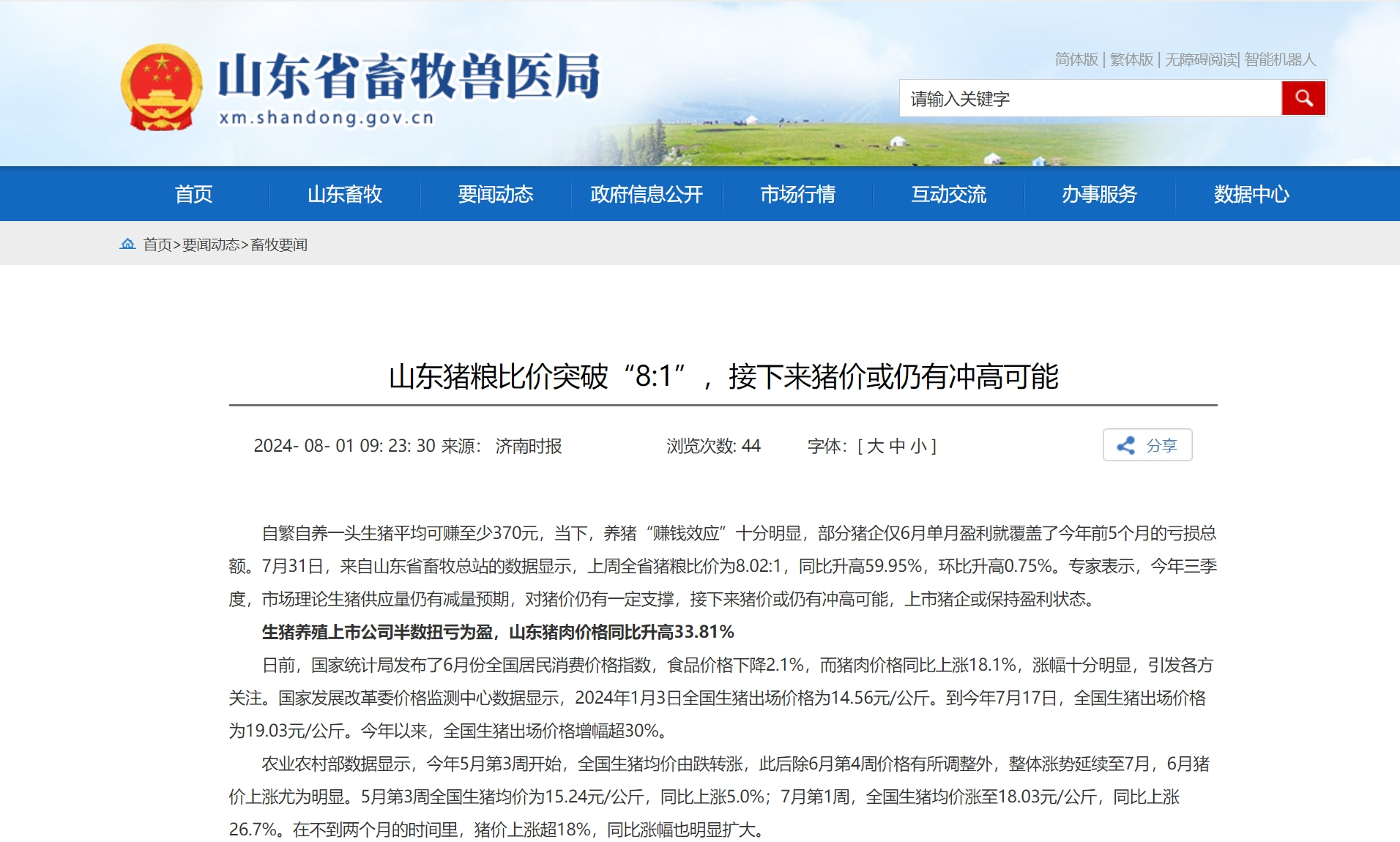 山東豬糧比價(jià)突破“8:1”,接下來(lái)豬價(jià)或仍有沖高可能