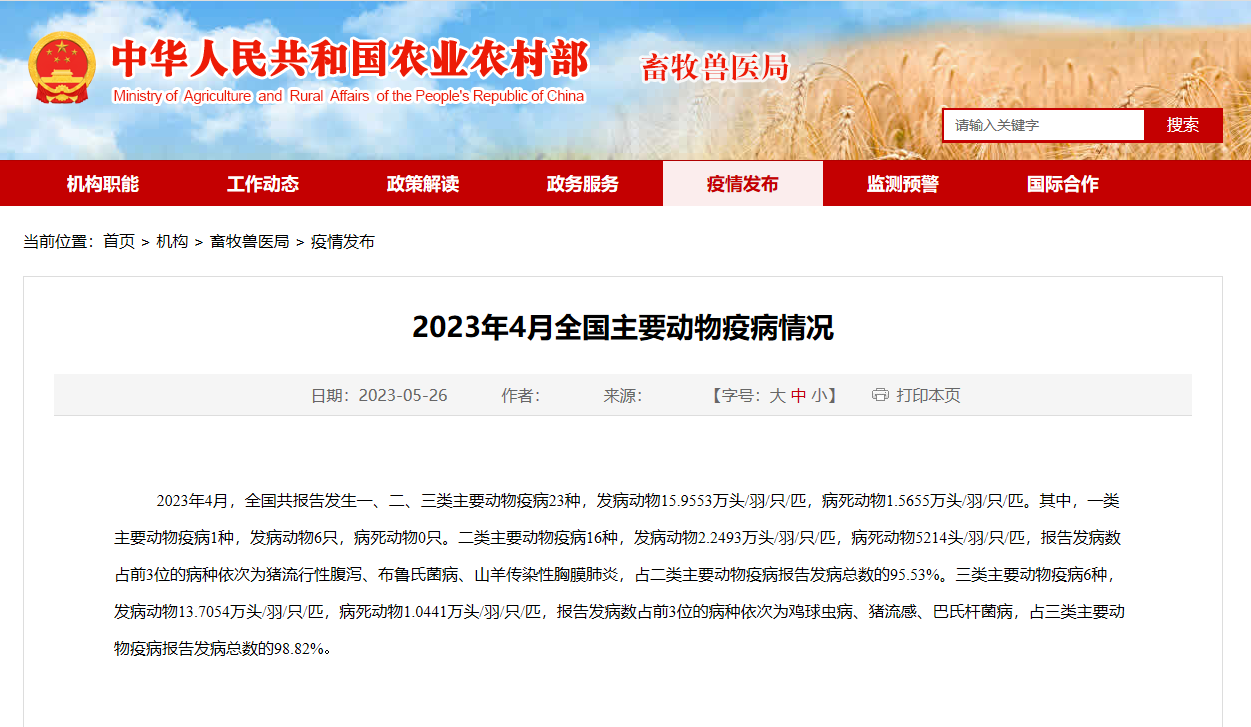 2023年4月,全國共報告發(fā)生一、二、三類主要動物疫病23種,發(fā)病動物15.9553萬頭/羽/只/匹,病死動物1.5655萬頭/羽/只/匹。其中,一類主要動物疫病1種,發(fā)病動物6只,病死動物0只。二類主要動物疫病16種,發(fā)病動物2.2493萬頭/羽/只/匹,病死動物5214頭/羽/只/匹,報告發(fā)病數(shù)占前3位的病種依次為豬流行性腹瀉、布魯氏菌病、山羊傳染性胸膜肺炎,占二類主要動物疫病報告發(fā)病總數(shù)的95.53%。三類主要動物疫病6種,發(fā)病動物13.7054萬頭/羽/只/匹,病死動物1.0441萬頭/羽/只/匹,報告發(fā)病數(shù)占前3位的病種依次為雞球蟲病、豬流感、巴氏桿菌病,占三類主要動物疫病報告發(fā)病總數(shù)的98.82%。
