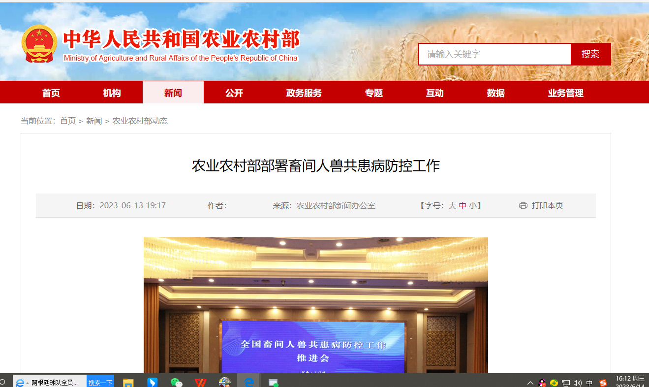 6月13日,農(nóng)業(yè)農(nóng)村部在河南省三門峽市召開全國畜間人獸共患病防控工作推進會,深入貫徹黨的二十大和中央農(nóng)村工作會議精神,全面分析畜間人獸共患病防控面臨的形勢,部署下一階段防控重點任務。農(nóng)業(yè)農(nóng)村部副部長馬有祥出席會議并講話。