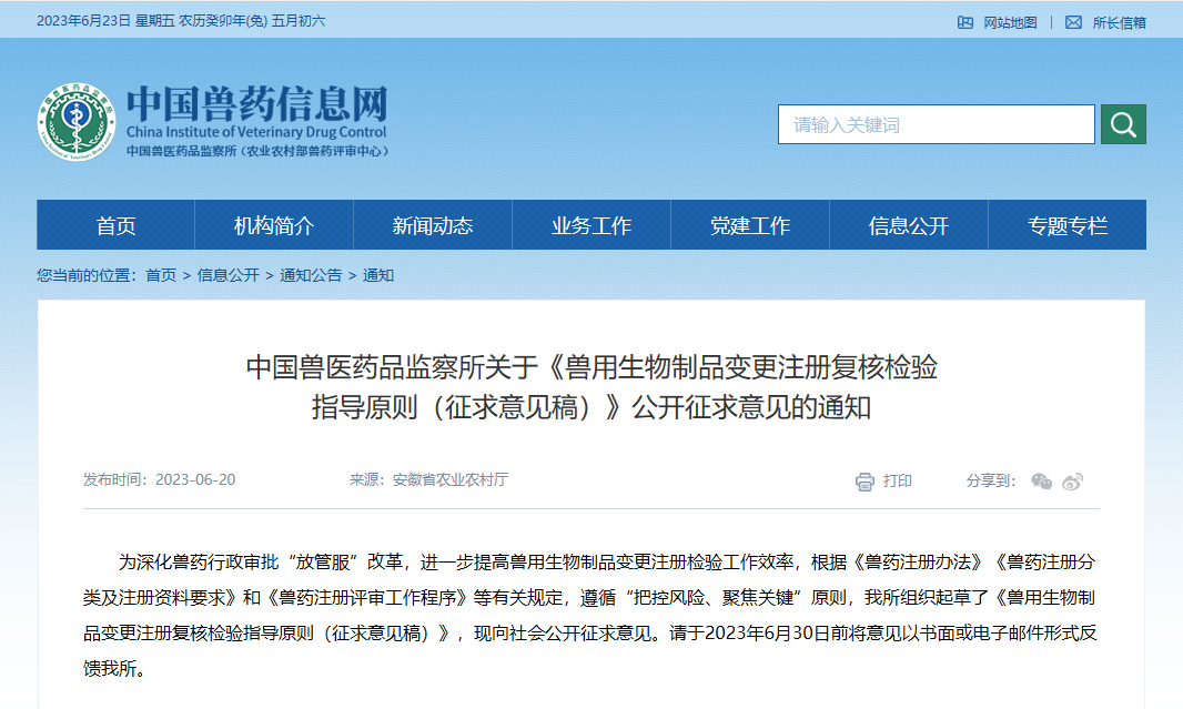 獸用生物制品變更注冊復核檢驗指導原則(征求意見稿)為進一步規(guī)范獸用生物制品注冊復核檢驗工作,切實提高變更注冊復核檢驗工作質效,按照深化獸藥行政審批“放管服”改革要求,根據(jù)《獸藥注冊辦法》《獸藥注冊分類及注冊資料要求》和《獸藥注冊評審工作程序》等有關規(guī)定,特制定本指導原則。一、本指導原則適用于獸用生物制品變更注冊需要進行評審事項,主要包括增加靶動物、變更獸藥含量規(guī)格、改變獸藥生產(chǎn)工藝、修改獸藥注冊