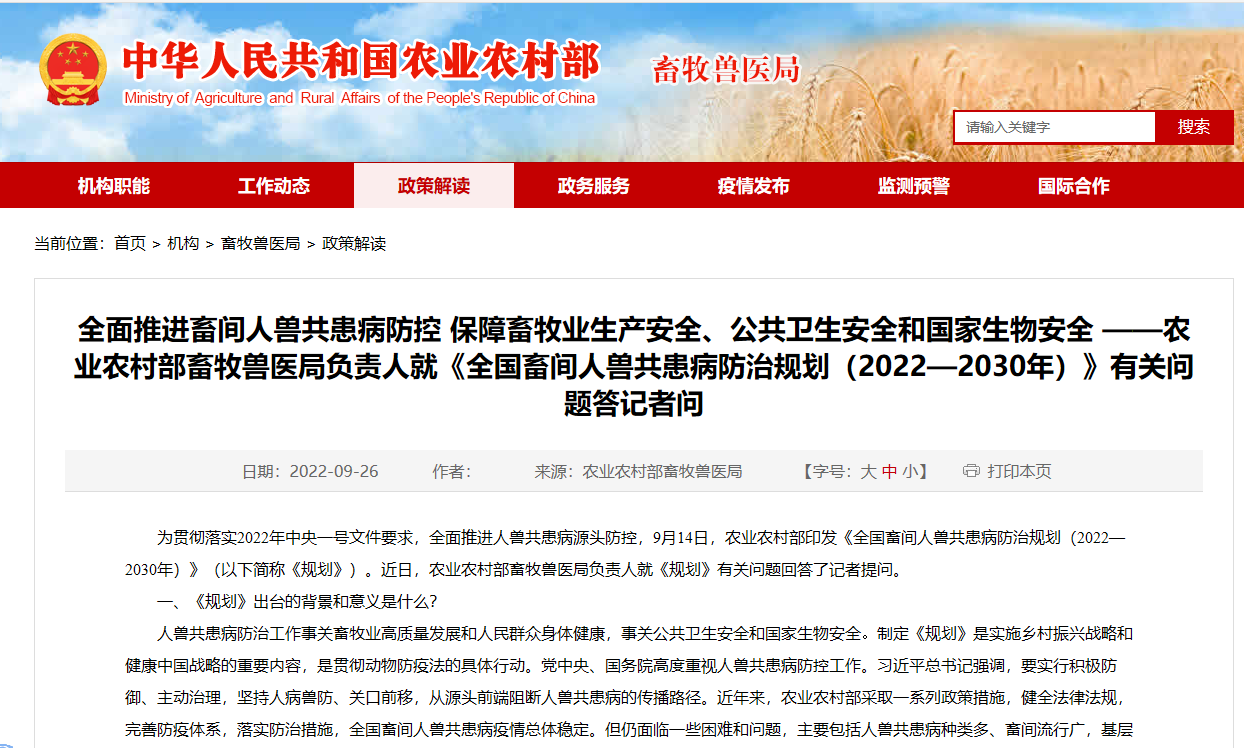 全面推進畜間人獸共患病防控 保障畜牧業(yè)生產(chǎn)安全、公共衛(wèi)生安全和國家生物安全——農(nóng)業(yè)農(nóng)村部畜牧獸醫(yī)局負責人就《全國畜間人獸共患病防治規(guī)劃(2022—2030年)》有關(guān)問題答記者問 為貫徹落實2022年中央一號文件要求,全面推進人獸共患病源頭防控,9月14日,農(nóng)業(yè)農(nóng)村部印發(fā)《全國畜間人獸共患病防治規(guī)劃(2022—2030年)》(以下簡稱《規(guī)劃》)。近日,農(nóng)業(yè)農(nóng)村部畜牧獸醫(yī)局負責人就《規(guī)劃》有關(guān)問題回答了記者提問?! ∫弧?