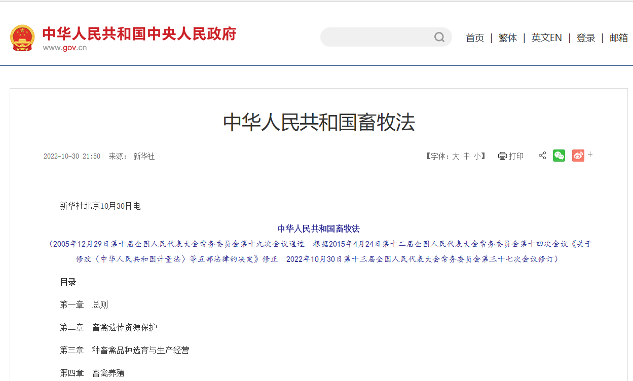 中華人民共和國畜牧法(2005年12月29日第十屆全國人民代表大會常務(wù)委員會第十九次會議通過 根據(jù)2015年4月24日第十二屆全國人民代表大會常務(wù)委員會第十四次會議《關(guān)于修改〈中華人民共和國計量法〉等五部法律的決定》修正 2022年10月30日第十三屆全國人民代表大會常務(wù)委員會第三十七次會議修訂)目錄第一章 總則第二章 畜禽遺傳資源保護第三章 種畜禽品種選育與生產(chǎn)經(jīng)營第四章 畜禽養(yǎng)殖第五章 草原畜牧業(yè)第六章 畜禽交易與