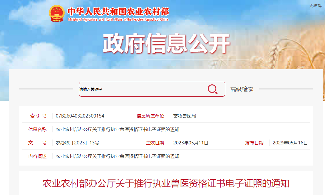 農(nóng)業(yè)農(nóng)村部辦公廳關(guān)于推行執(zhí)業(yè)獸醫(yī)資格證書電子證照的通知