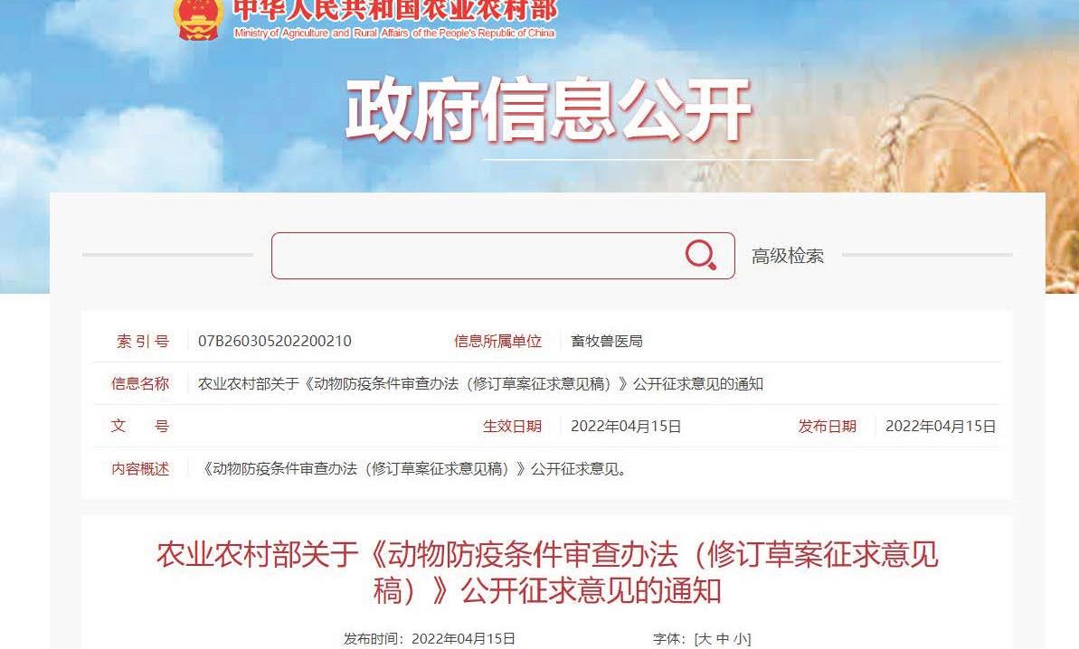 為了規(guī)范動物防疫條件審查,有效預防、控制、凈化、消滅動物疫病,防控人畜共患傳染病,保障公共衛(wèi)生安全和人體健康,根據(jù)《中華人民共和國動物防疫法》,我部起草了《動物防疫條件審查辦法(修訂草案征求意見稿)》,現(xiàn)向社會公開征求意見。公眾可通過以下途徑和方式提出反饋意見: