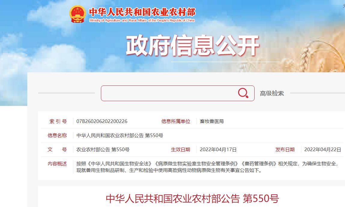 按照《中華人民共和國生物安全法》《病原微生物實驗室生物安全管理條例》《獸藥管理條例》相關規(guī)定,為確保生物安全,現(xiàn)就獸用生物制品研制、生產(chǎn)和檢驗中使用高致病性動物病原微生物有關事宜公告如下。