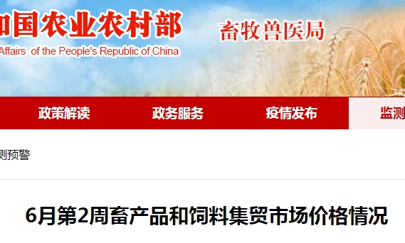 據(jù)對(duì)全國(guó)500個(gè)縣集貿(mào)市場(chǎng)和采集點(diǎn)的監(jiān)測(cè),6月第2周(采集日為6月13日)生豬產(chǎn)品、雞肉價(jià)格環(huán)比上漲,雞蛋、商品代肉雛雞、牛羊產(chǎn)品、豆粕、育肥豬配合飼料、肉雞配合飼料、蛋雞配合飼料價(jià)格環(huán)比下跌,玉米、商品代蛋雛雞價(jià)格環(huán)比持平。
