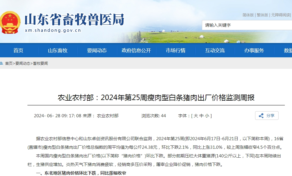 農(nóng)業(yè)農(nóng)村部:2024年第25周瘦肉型白條豬肉出廠價(jià)格監(jiān)測(cè)周報(bào)