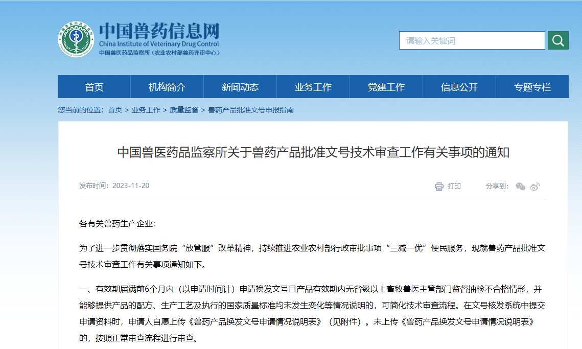 中國獸醫(yī)藥品監(jiān)察所關(guān)于獸藥產(chǎn)品批準(zhǔn)文號技術(shù)審查工作有關(guān)事項(xiàng)的通知各有關(guān)獸藥生產(chǎn)企業(yè): 為了進(jìn)一步貫徹落實(shí)國務(wù)院“放管服”改革精神,持續(xù)推進(jìn)農(nóng)業(yè)農(nóng)村部行政審批事項(xiàng)“三減一優(yōu)”便民服務(wù),現(xiàn)就獸藥產(chǎn)品批準(zhǔn)文號技術(shù)審查工作有關(guān)事項(xiàng)通知如下。一、有效期屆滿前6個(gè)月內(nèi)(以申請時(shí)間計(jì))申請換發(fā)文號且產(chǎn)品有效期內(nèi)無省級以上畜牧獸醫(yī)主管部門監(jiān)督抽檢不合格情形,并能夠提供產(chǎn)品的配方、生產(chǎn)工藝及執(zhí)行的國家質(zhì)量標(biāo)準(zhǔn)均未發(fā)
