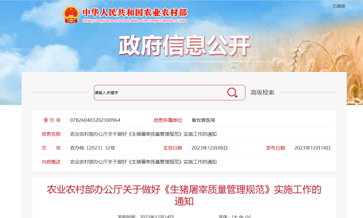 農(nóng)業(yè)農(nóng)村部辦公廳關(guān)于做好《生豬屠宰質(zhì)量管理規(guī)范》實(shí)施工作的通知