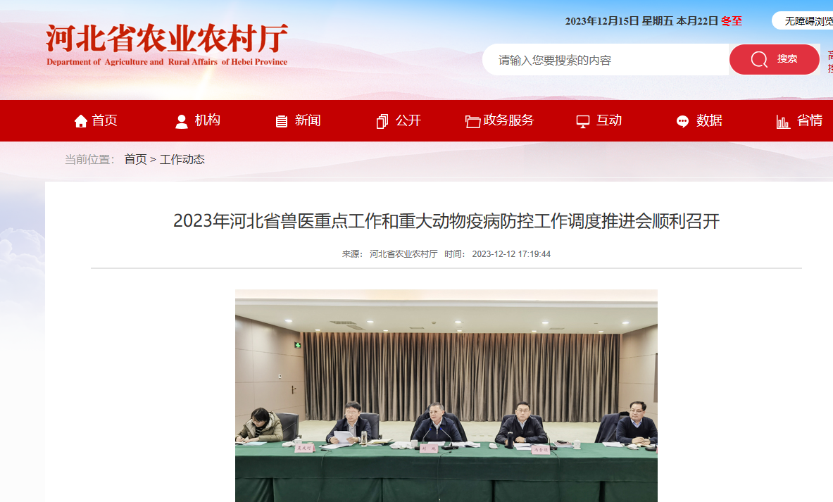 2023年河北省獸醫(yī)重點(diǎn)工作和重大動物疫病防控工作調(diào)度推進(jìn)會順利召開[本網(wǎng)訊]12月12日,河北省農(nóng)業(yè)農(nóng)村廳組織召開全省獸醫(yī)重點(diǎn)工作和重大動物疫病防控工作調(diào)度推進(jìn)會,會議主要任務(wù)是深入學(xué)習(xí)貫徹習(xí)近平總書記重要講話精神,認(rèn)真落實(shí)農(nóng)業(yè)農(nóng)村部、河北省委省政府及廳黨組工作安排,總結(jié)2023年全省獸醫(yī)工作,安排部署2024年重點(diǎn)工作。省農(nóng)業(yè)農(nóng)村廳副廳長劉飚出席會議并講話,二級巡視員馮雪領(lǐng)主持會議。會議指出,2023年全