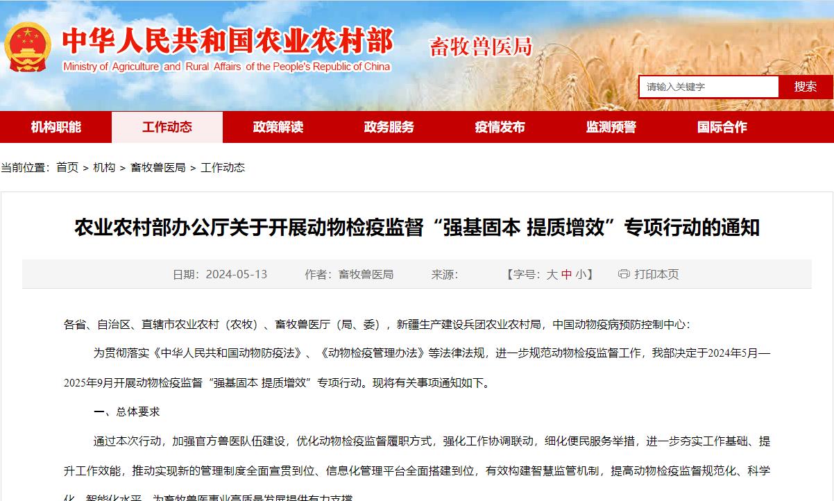 農(nóng)業(yè)農(nóng)村部辦公廳關(guān)于開展動物檢疫監(jiān)督“強(qiáng)基固本 提質(zhì)增效”專項(xiàng)行動的通知