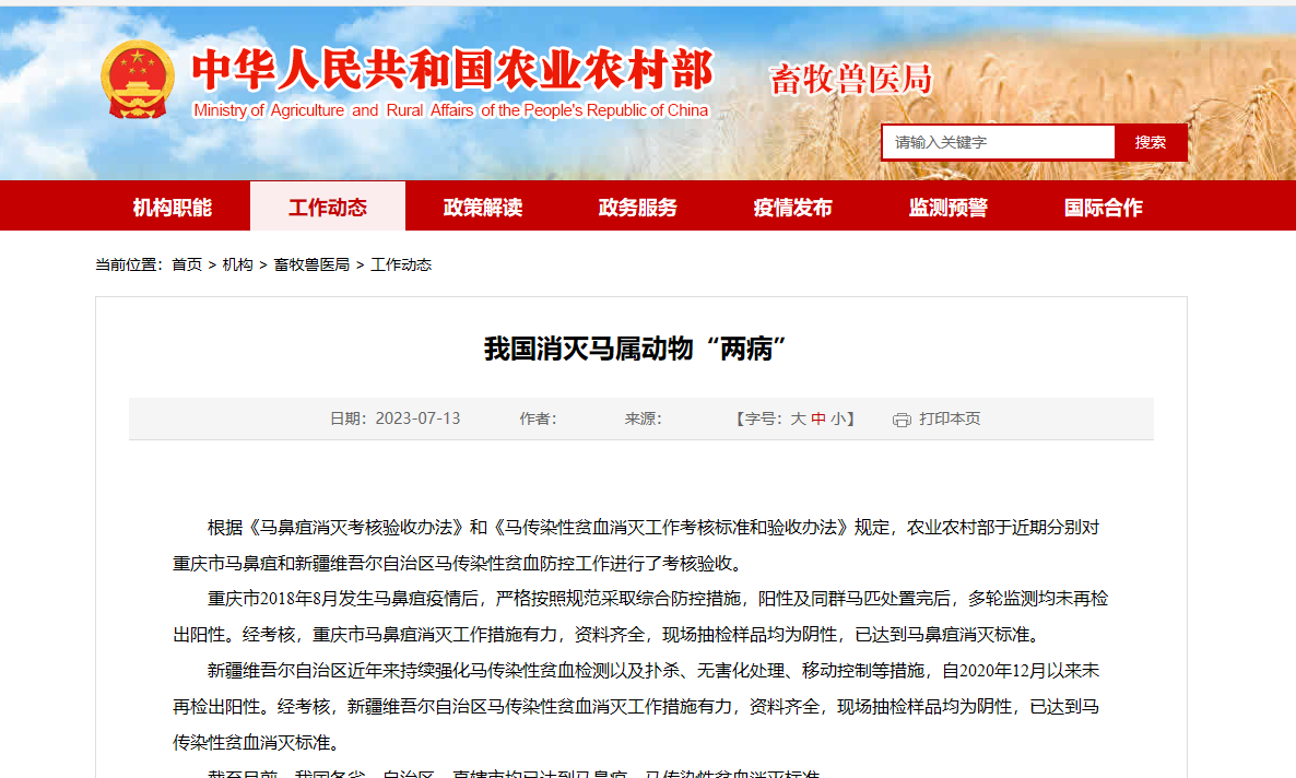 我國消滅馬屬動物“兩病” 根據(jù)《馬鼻疽消滅考核驗收辦法》和《馬傳染性貧血消滅工作考核標準和驗收辦法》規(guī)定,農(nóng)業(yè)農(nóng)村部于近期分別對重慶市馬鼻疽和新疆維吾爾自治區(qū)馬傳染性貧血防控工作進行了考核驗收?! ≈貞c市2018年8月發(fā)生馬鼻疽疫情后,嚴格按照規(guī)范采取綜合防控措施,陽性及同群馬匹處置完后,多輪監(jiān)測均未再檢出陽性。經(jīng)考核,重慶市馬鼻疽消滅工作措施有力,資料齊全,現(xiàn)場抽檢樣品均為陰性,已達到馬鼻疽消滅標