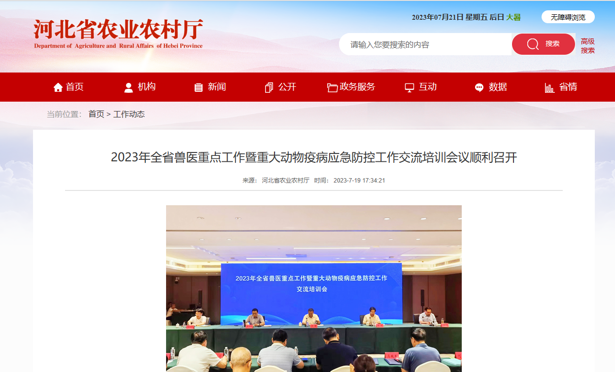 2023年全省獸醫(yī)重點工作暨重大動物疫病應(yīng)急防控工作交流培訓(xùn)會議順利召開 來源: 河北省農(nóng)業(yè)農(nóng)村廳 時間: 2023-7-19 17:34:21 為總結(jié)2023年上半年全省獸醫(yī)重點工作和重大動物疫病應(yīng)急防控工作情況,研究部署下半年工作,7月18日~19日,河北省農(nóng)業(yè)農(nóng)村廳在定州市召開全省獸醫(yī)重點工作暨重大動物疫病應(yīng)急防控工作交流培訓(xùn)會議。河北省農(nóng)業(yè)農(nóng)村廳副廳長劉飚出席會議并講話,定州市委書記張濤致辭。會議由省農(nóng)業(yè)農(nóng)村廳二級巡視員馮雪