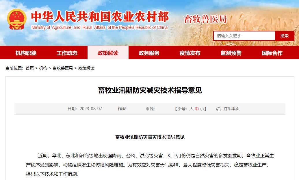 畜牧業(yè)汛期防災(zāi)減災(zāi)技術(shù)指導(dǎo)意見 近期,華北、東北和沿海等地出現(xiàn)強降雨、臺風(fēng)、洪澇等災(zāi)害,8、9月份仍是自然災(zāi)害的多發(fā)頻發(fā)期,畜牧業(yè)正常生產(chǎn)秩序受到影響,動物疫情發(fā)生和傳播風(fēng)險增加。為有效應(yīng)對災(zāi)害天氣影響,最大程度降低災(zāi)害損失,穩(wěn)定畜牧業(yè)生產(chǎn),提出以下技術(shù)和工作措施。(一)加強災(zāi)害監(jiān)測預(yù)警和物資儲備。加強重大天氣變化預(yù)判預(yù)警,充分利用廣播電視、短信微信、鄉(xiāng)村大喇叭等手段,及時發(fā)布預(yù)警信息和防災(zāi)減災(zāi)技
